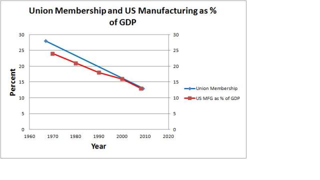But something popped out when I looked at the Manufacturing data and the Union membership data. They looked like they were almost the same data. So I graphed those two sets of data and I knew I was on to something because in this case I didn’t need to adjust the ranges of Manufacturing as percent of GDP to match the Union membership – they both graphed fairly with 0-30%. The graph is shown below: