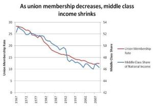 There was a post at ThinkProgress showing a graph that the authors claims to prove a correlation between declining share of national income for the Middle Class with declining Union membership. At first glance, the apparent correlation is startling but since I’m not a member of the ‘easily fooled’ sect, I peered deeper into the data. There are actually two problems with this graph – the first problem reveals how quickly people can be fooled who don’t understand Math and the second problem shows what is really correlated with declining Union Membership.