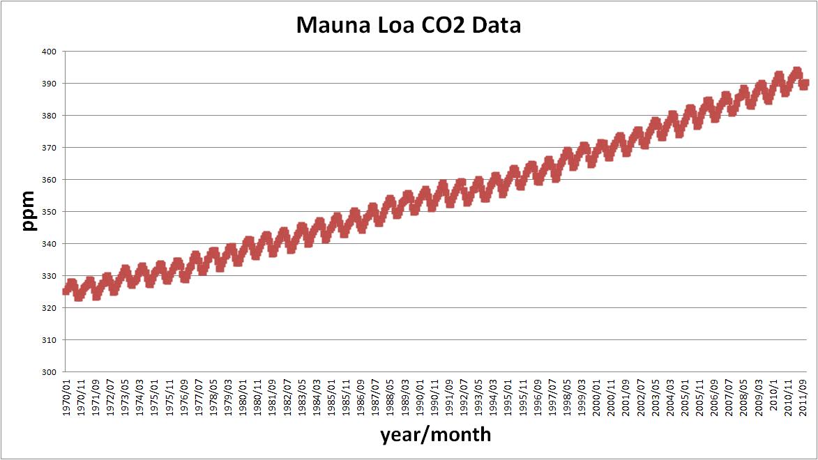 The first graph below shows the amount of CO2 in the atmosphere as measured in parts per million (ppm) and sure enough we are continuing to pump more CO2 into the atmosphere on a fairly linear rate and there doesn’t seem to be much change to that rate over the time period measured. This data was obtained from the Mauna Loa measuring station.