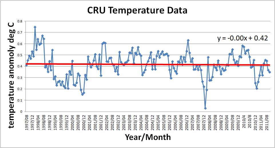 When looking at the CRU temperatures over the past 14 years you can see that there is no trend up or down on temperature which is validated by the linear line fit having a slope of 0.00.
