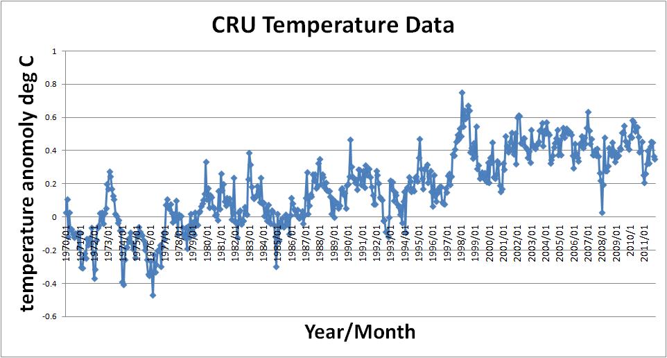 The next two graphs are generated from temperature data obtained from popular sources used by Climate Scientists – The University of Alabama at Huntsville (UAH) and the Climate Research Unit (CRU).
