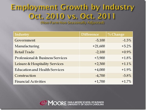 The latest report from the Charleston Regional Business Journal states that job growth in 2011 inched up over 2010 with Manufacturing seeing the biggest increases of 5.2% growth. That isn’t bad considering the debilitating climate of business fostered by the over regulation from the Obama White House.