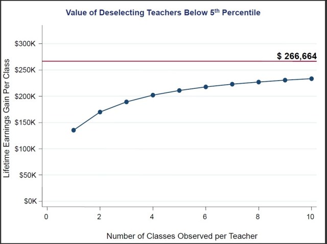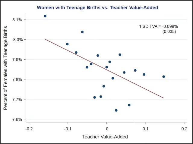 “Students assigned to high-VA teachers are more likely to attend college, attend higher- ranked colleges, earn higher salaries, live in higher SES neighborhoods, and save more for retirement. They are also less likely to have children as teenagers. Teachers have large impacts in all grades from 4 to 8. On average, a one standard deviation improvement in teacher VA in a single grade raises earnings by about 1% at age 28. Replacing a teacher whose VA is in the bottom 5% with an average teacher would increase students’ lifetime income by more than $250,000 for the average classroom in our sample. We conclude that good teachers create substantial economic value and that test score impacts are helpful in identifying such teachers.”