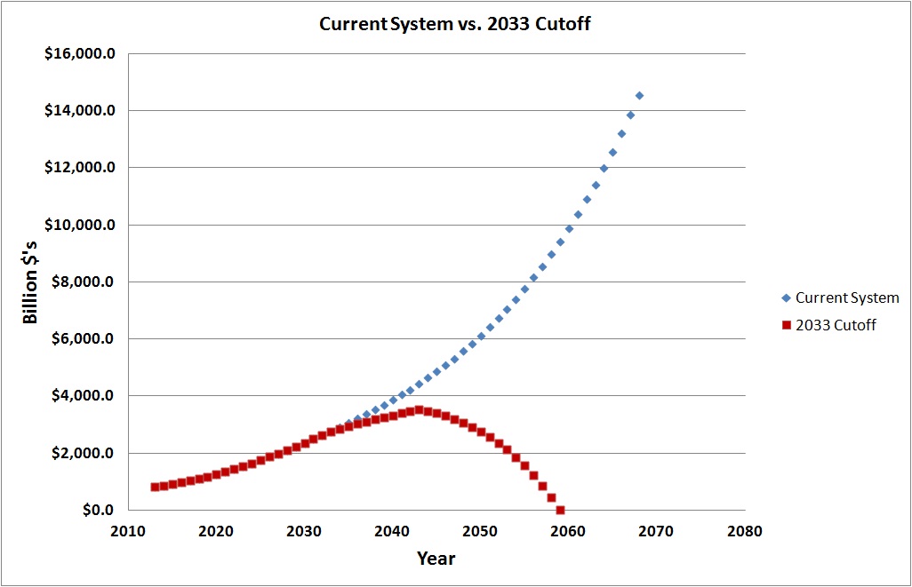 Using a retirement calculator, assuming you put 15% of your salary in a 401k and have a balanced portfolio, a person will need a at least 20 years to sufficiently plan for their retirement (living during the retirement years on 50% of what they made while employed) so my proposal is to cutoff new social security recipients starting in 2034. That means that the last year to enter Social Security is 2033 and therefore those people who will be 45 years old in 2013 will be the last people to enter Social Security (I’m also setting the retirement age at 65 years old). Those, like myself, who will be younger than 45 next year will have at least 21 years to plan for our retirement by the time we reach 65 years old (2034) and can, of course, choose to work longer as many are doing now.