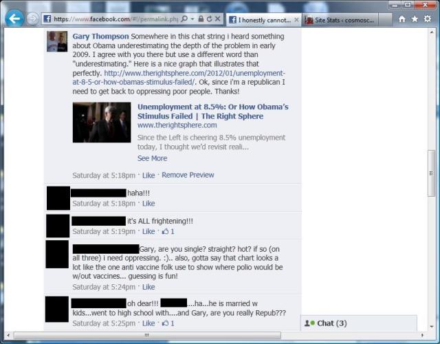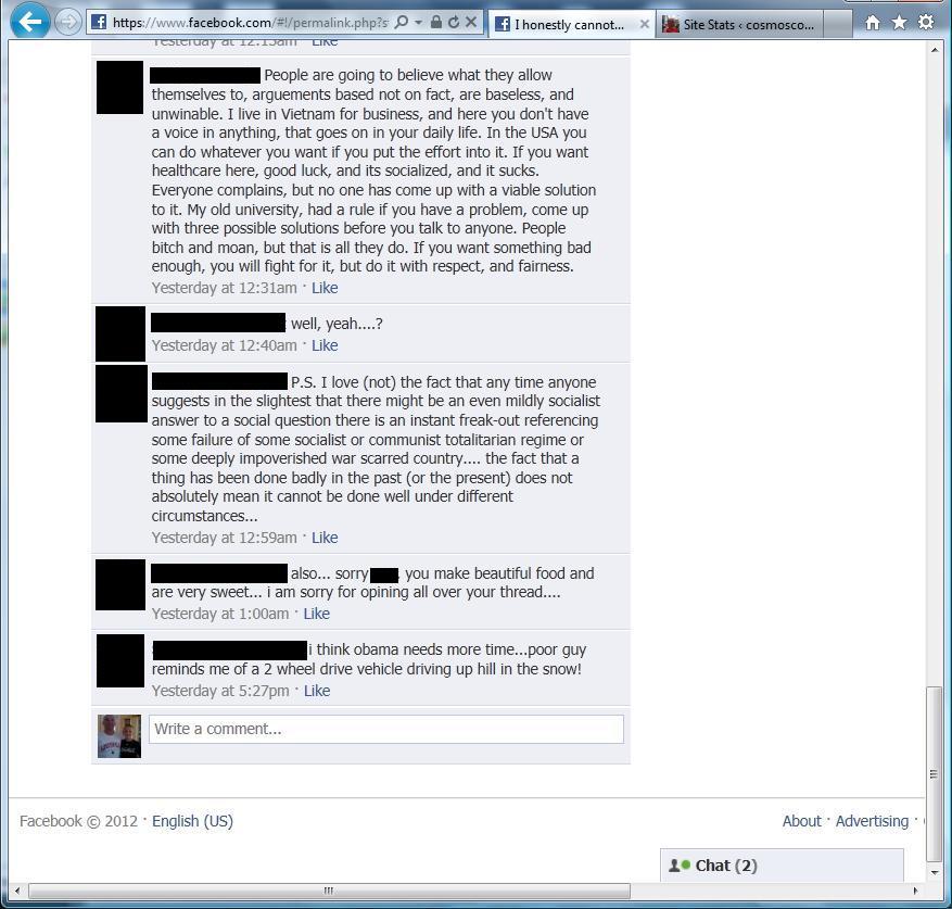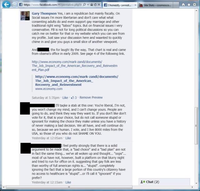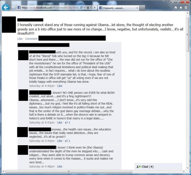 Over the weekend I jumped into a Facebook political discussion, something that I normally avoid, and didn’t get too deep into it but I think the conversations that we had should be viewed by all conservatives. This is what we are up against in 2012 and we better open our eyes or risk 4 more years of Obama and a Democrat controlled Senate.