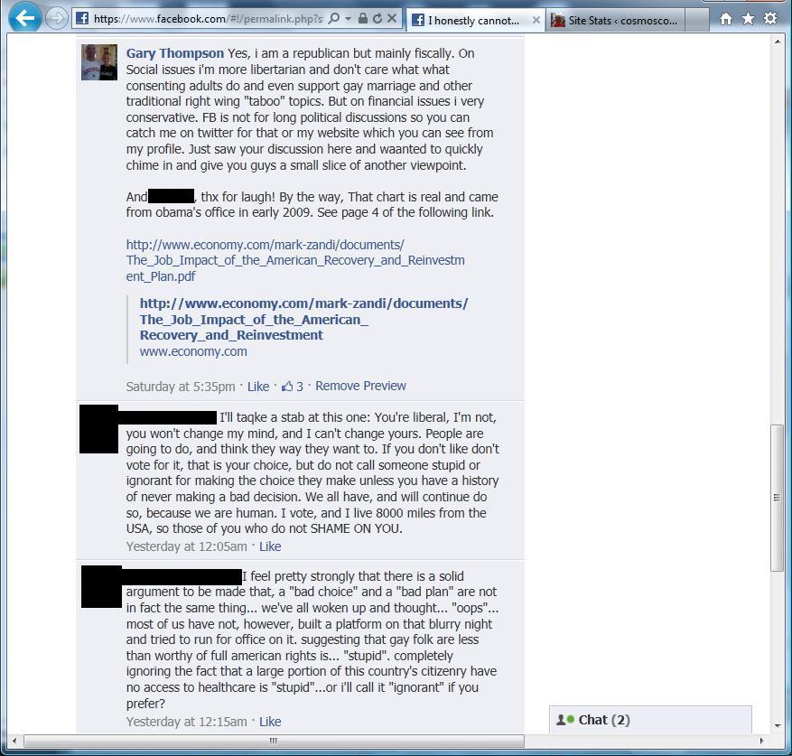 The conversation is pasted below and I’ll leave it to the reader to digest it and draw their own conclusions. I must say that many of the individuals listed on this stream are known to me and they can be considered college educated and professionals so they have the ability to think for themselves. While I interjected contrarian opinions, I respect the way they treated me and this is the way we should have our debates (although they failed to abide by one of my rules for a reasoned debate – ignoring the facts). I have blacked out all names and pictures except my own to preserve their anonymity since I didn’t solicit their permission to publish the conversation.