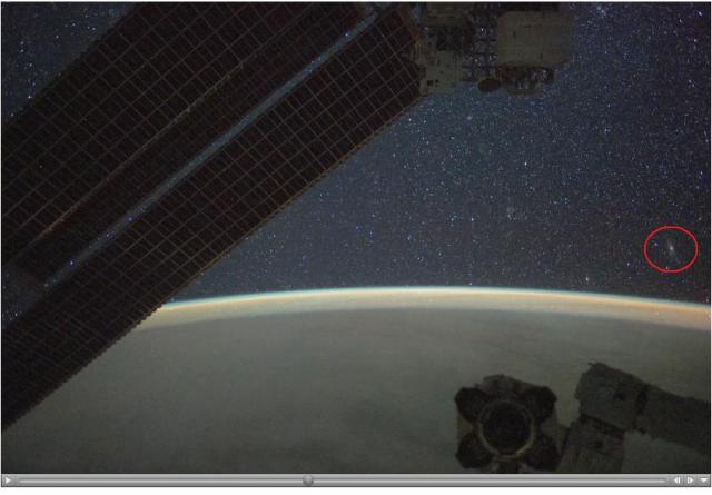 Amidst the vast array of stars, there are objects which appear to be non-stellar that will be obvious to individuals even if they are not familiar with the night sky and the most prominent is the Andromeda galaxy. This is our closest neighboring galaxy at around 2.5 million light years away and I was amazed at how easily we can see it with the camera in space. On earth we can see the fuzzy nature of the Andromeda galaxy with our naked eyes but only from a true dark sky location (no man-made light pollution, clear sky and a new moon). Even if you live in a city, you can see details of the galaxy with binoculars or a telescope but I had no idea this galaxy was so easily viewed with the naked eye in space. Below are two screen captures each taken from the first two videos above and I superimposed a red circle around the Andromeda galaxy.