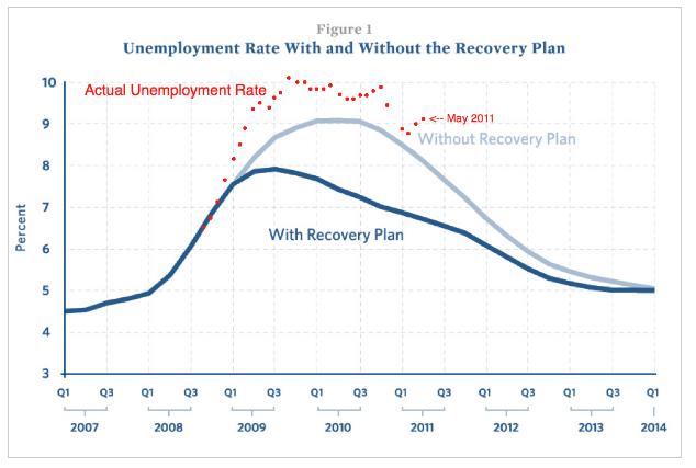 Now here is this same graph with the actual unemployment percentages plotted in red through May 2011.
