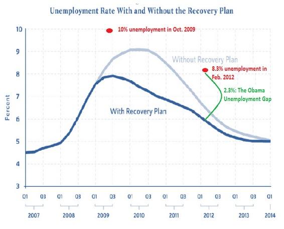 Here was a graph from the Obama’s economic advisor’s original report showing what would happen to Unemployment with and without the Stimulus.