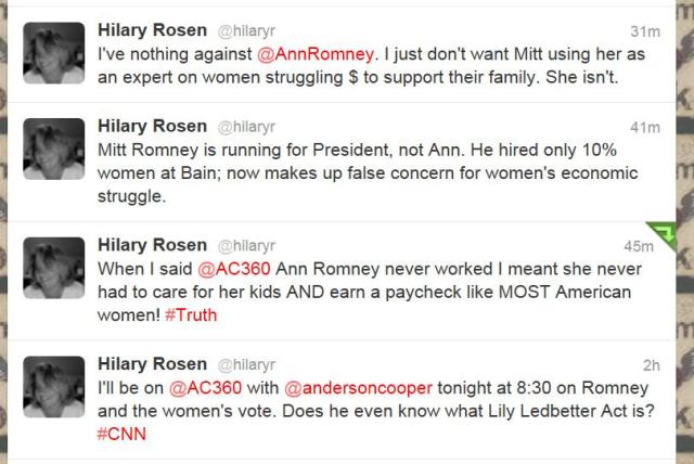 Today on AC360, Hilary Rosen made the following statements about Ann Romney (Mitt Romney’s wife):