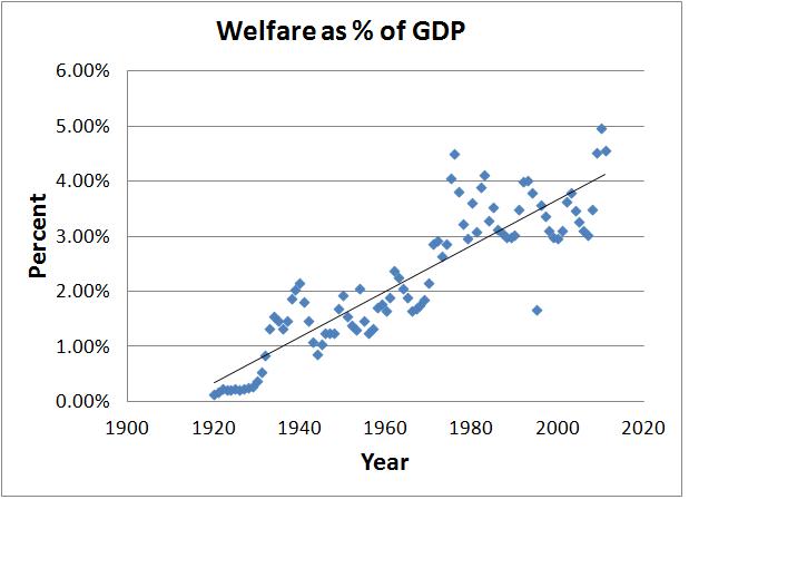 In case you needed one more piece of evidence that Welfare is on an unsustainable course, here is a graph of Welfare spending as a percent of GDP and you can see we are on an upward trend with no plateau in site (note the trend line).