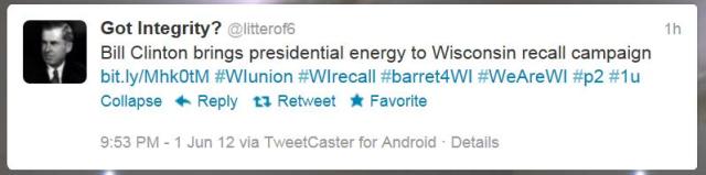 Nice energy Bill Clinton brought, huh?  At least Clinton had the guts to show up in Wisconsin and defend his base.  This can’t be said of Obama who kept himself far away from #Wiunion.   I wonder if union members in Wisconsin will remember this in November.