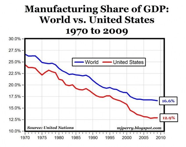 Part of the explanation of this chart can be attributed to the fact that during the 1970’s, when the divergence in productivity and hourly wages started, the US manufacturing as a percent of GDP started its decline.