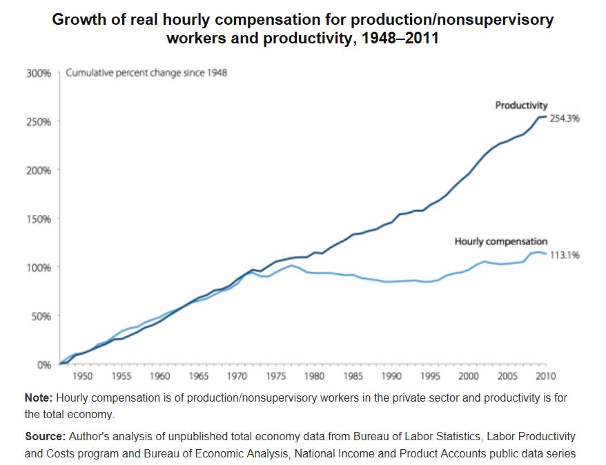 “The hourly compensation of a typical worker grew in tandem with productivity from 1948–1973. That can be seen in Figure A, which presents both the cumulative growth in productivity per hour worked of the total economy (inclusive of the private sector, government, and nonprofit sector) since 1948 and the cumulative growth in inflation-adjusted hourly compensation for private-sector production/nonsupervisory workers (a group comprising over 80 percent of payroll employment). After 1973, productivity grew strongly, especially after 1995, while the typical worker’s compensation was relatively stagnant. This divergence of pay and productivity has meant that many workers were not benefitting from productivity growth—the economy could afford higher pay but it was not providing it.”