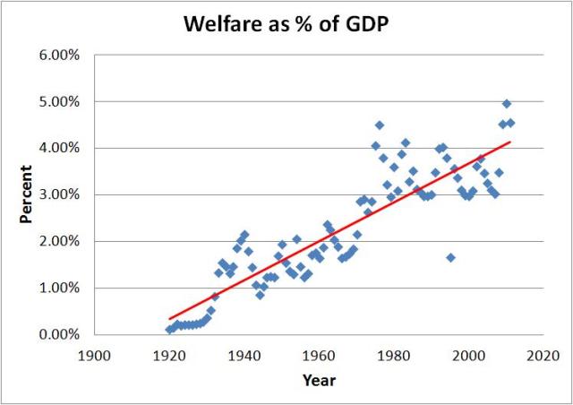 In addition to the graph above, let’s also look at a complete history of Welfare spending as a percent of GDP and this graph is shown below.
