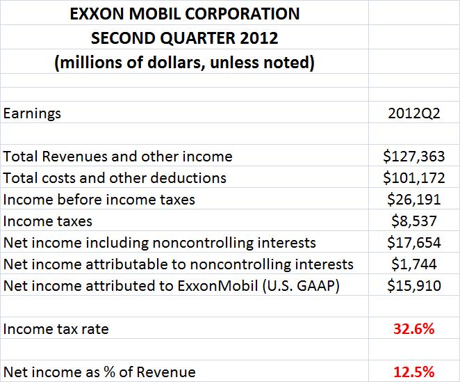 Now let’s look at the income tax rate that ExxonMobil paid during the 2nd quarter of 2012 but before we do that, let’s see what the average corporate tax rate is for US corporations. It is well known that the US has the highest corporate tax rates in the world at 39.2% but large corporations use various accounting tricks to get that lowered as this link shows.