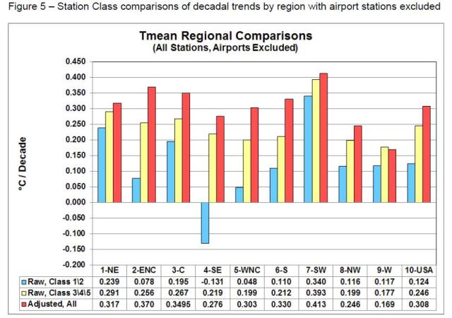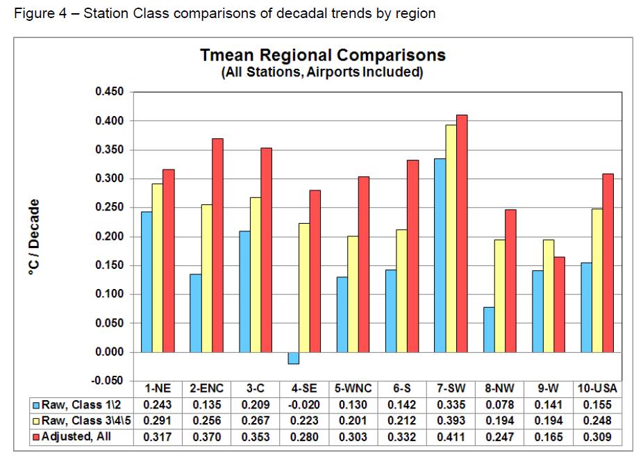 “The new improved assessment, for the years 1979 to 2008, yields a trend of +0.155°C per decade from the high quality sites, a +0.248° C per decade trend for poorly sited locations, and a trend of +0.309° C per decade after NOAA adjusts the data. This issue of station siting quality is expected to be an issue with respect to the monitoring of land surface temperature throughout the Global Historical Climate Network and in the BEST network.”