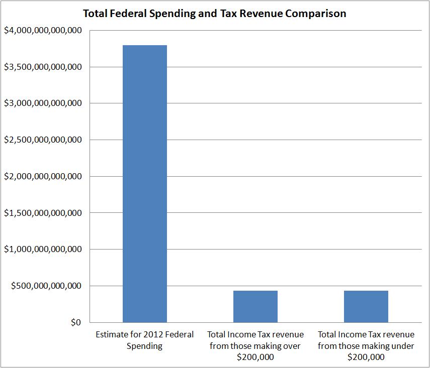 I’ll use the latest IRS data from 2009 and the US Government Spending site which shows the estimated 2012 federal government spending to generate the following graphs (feel free to check my math). I’ll admit that using tax revenues from 2009 to compare with federal spending in 2012 isn’t exactly an apples to apples comparison but it’s not my fault the IRS hasn’t released data from later years and as you’ll see from the graphs, that even increasing these revenues with inflation doesn’t come close to matching our budget deficits.