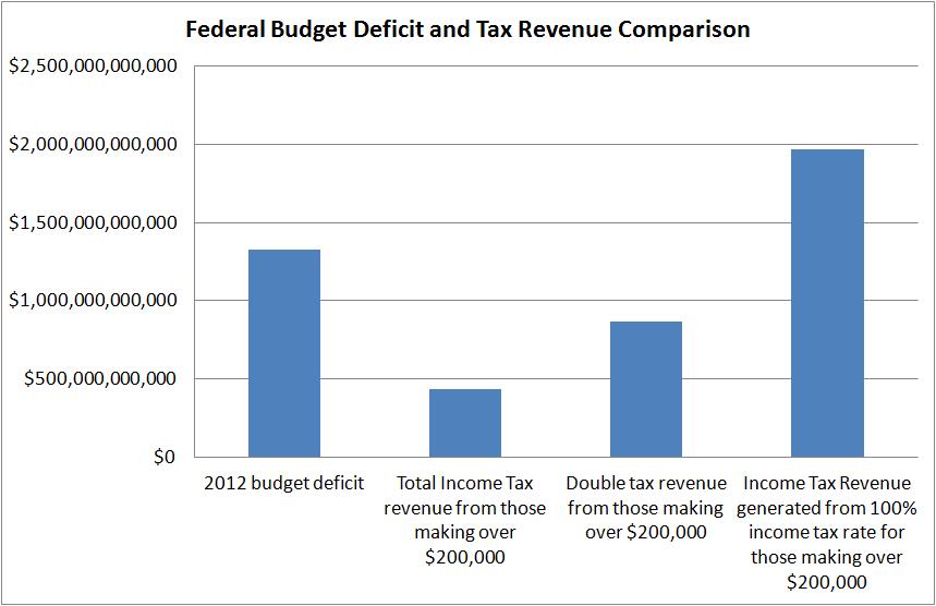 You can see from the graph above that even if we DOUBLE the income tax rate of those making over $200,000 per year, we still don’t make up the $1.3 trillion deficit our government will run in 2012. We’d have to take 100% of the income from those making over $200,000 per year to balance the budget and actually run a surplus. So even if Leftists controlled the House, Senate and White House and they chose to enact this radical agenda, ask yourself why these individuals would continue to work if all their money went to the federal government? This would only work for 1 year and then we’d be faced with another budget deficit that would be far more than $1.3 trillion because those who make over $200,000 would chose to not work and then the federal government would lose out on half of their income tax revenue.