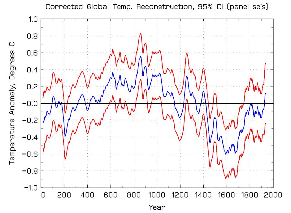 Here is the graph from their reconstruction showing annual temperature anomalies (The blue line shows the average of the data and the red lines show the 95% confidence intervals):