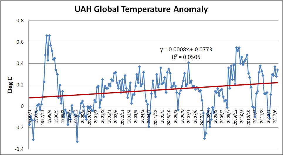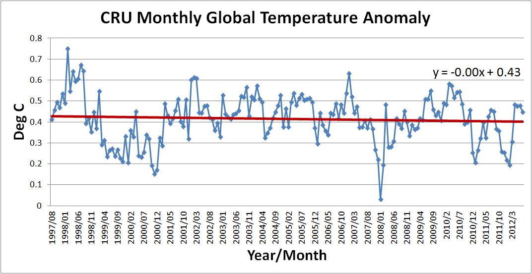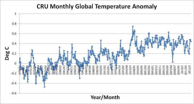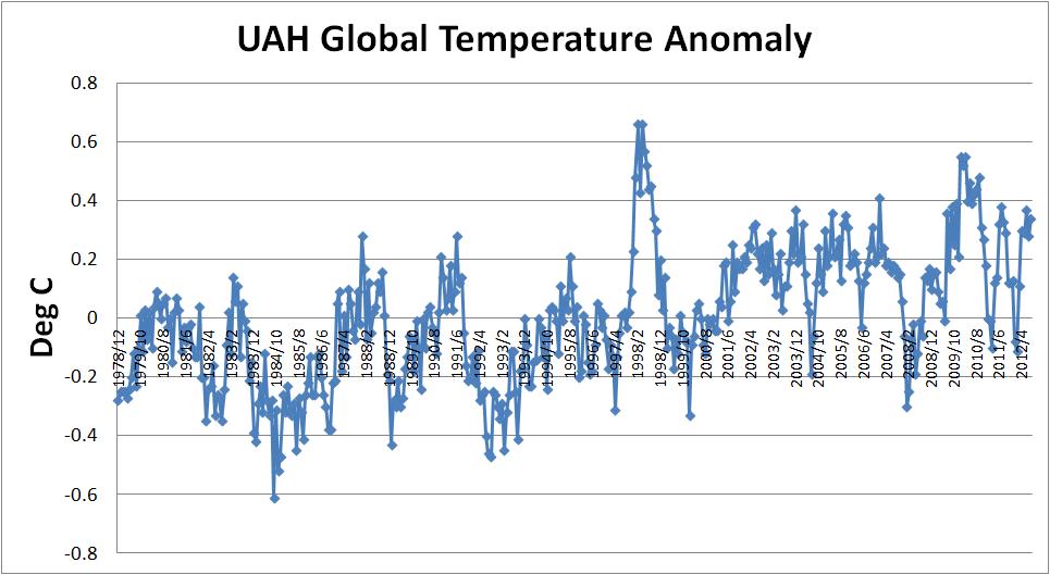 Here are the plots of global temperature averages compiled by the Climate Research Unit and the University of Alabama Huntsville.