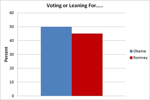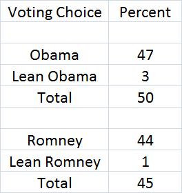 From this poll, we see that Obama has a 5 percentage point advantage over Romney with 1,000 likely voters (50% to 45%). The main question posed was: