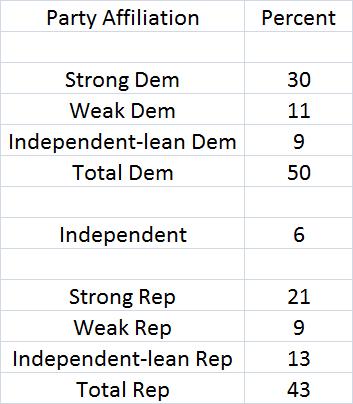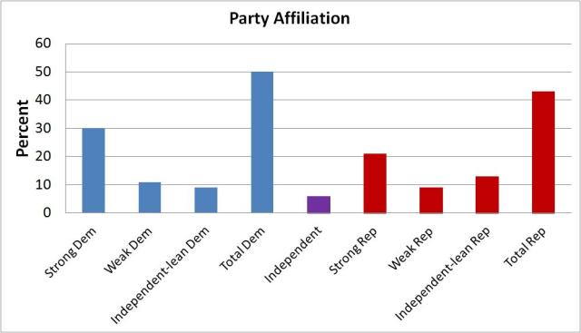 Wow, this looks pretty bad for Romney! But when we look at the party affiliation of the 1,000 people sampled we see a large bias to Democratic voters. The results below are to the following question: