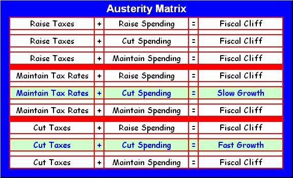 - The optimal fiscal austerity policy involves a combination of tax cuts and deficit reduction, which leads to rapid growth, or exactly what is needed following an economic crash. But, cutting taxes while maintaining or increasing spending levels only hurtles us over the fiscal cliff.