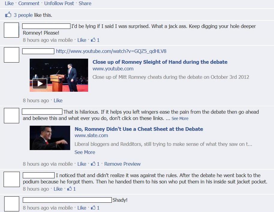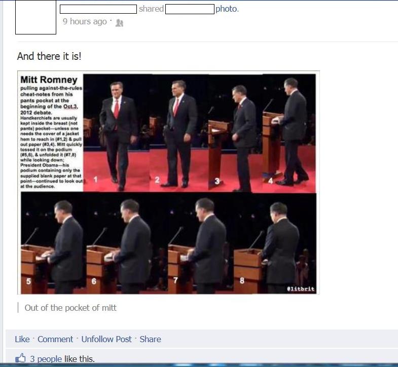 The latest theory is that Mitt Romney had a cheat sheet. Yes, you read that right. Never mind that it was obvious that it wasn’t a cheat sheet but a handkerchief and there is even a picture showing Romney using the handkerchief to wipe his upper lip. That didn’t stop some idiots in my Facebook Timeline from claiming they had found the reason for Romney’s debate success. I have dubbed these individuals ‘hankie truthers’ and will call them such when I see them on Social Media.