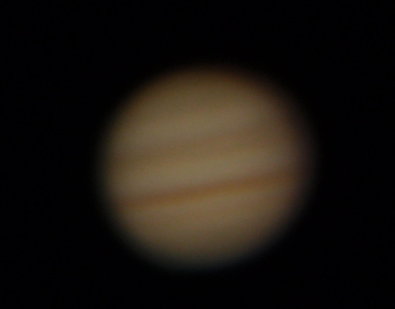 Jupiter with its well know Red Spot visible in the top band (which is really the southern band but the picture is inverted due to the Newtonian telescope optics)