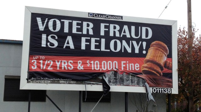 “Civil rights groups have complained about what they say are subtle efforts of intimidation. They point to a billboard campaign in swing states such as Ohio warning voter fraud is a felony punishable by up to three and a half years in prison and a $10,000 fine.”