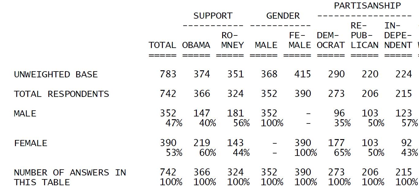 You’ll see from the partisanship columns that those who identify with Democrats are 37% (273/742) and those who identify with Republican are 28% (206/742) so this poll has a D+9 sampling bias. Ohio is a true swing state and if you think the characteristic of a swing state is a 9 percentage point advantage to one party then you are sadly mistaken. Obama won the 2008 presidential election in Ohio by only 4.5 percentage points and that was with a totally different political climate than we have in 2012. To think that the D/R advantage in Ohio would be twice what it was in 2008 is wishful thinking for Leftists.