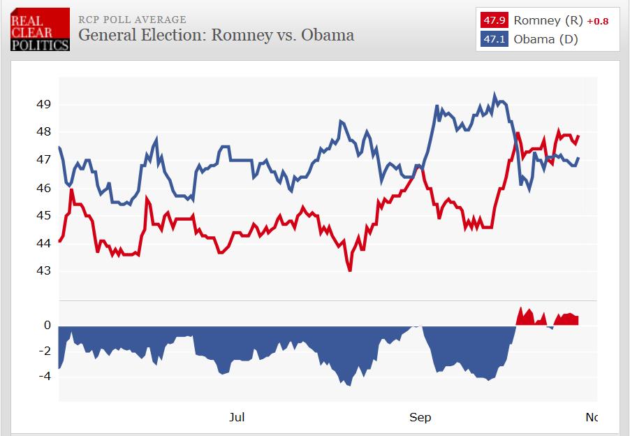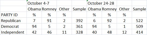 Notice that in early October, Romney had a lead over Obama with regard to independent voters 46% to 42% but that gap widened at the end of October to 48% to 42%.