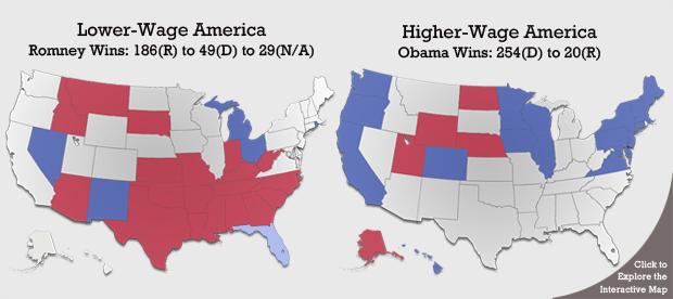 Romney carried the lower wage states and Obama carried the higher wage states and both results weren’t even close! Remind Leftists of this fact the next time they trot out that meme.
