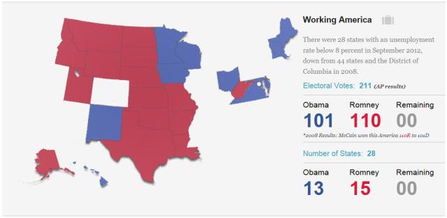 The next analysis was performed like the first but instead of dividing the US based on median income; they used the state unemployment rates. One group contains the states with Unemployment rates over 8% (Out of Work America) and the other group contains states with unemployment rates below 8% (Working America).