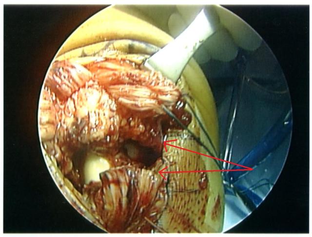 For those who are interested, the details of this surgery can be found here (with a more medically detailed link here) and a picture of my knee during the surgery is shown below (the red arrows showed the rupture in the patella tendon).