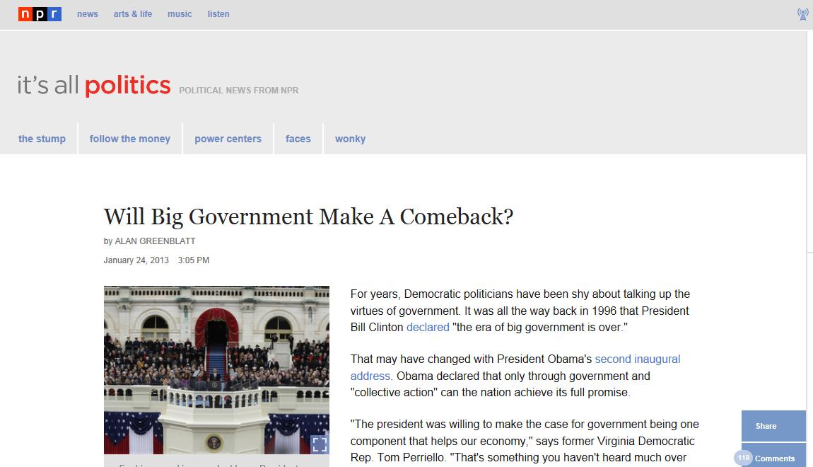 “That may have changed with President Obama’s second inaugural address. Obama declared that only through government and “collective action” can the nation achieve its full promise.”