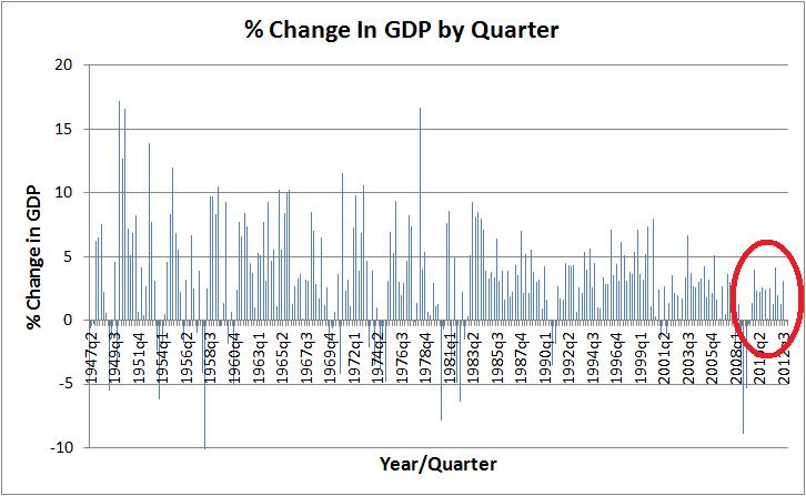 First, here is the graph of quarterly GDP percent changes from 1947 to 2012Q4.