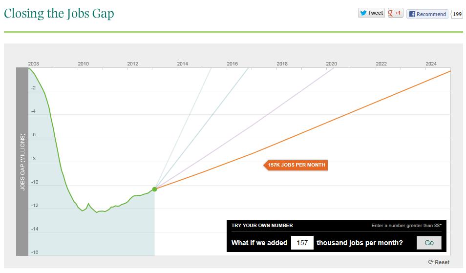 The Hamilton Project’s Jobs Gap calculator does indeed show that if future months look like January 2013 (157,000 net jobs added) then we won’t close the jobs gap until 2025.