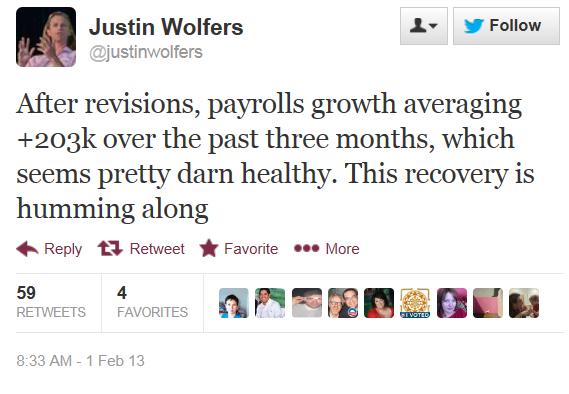 Justin Wolfers (@JustinWolfers), an economics professor at the University of Michigan, sent out this tweet after the BLS jobs data was released.
