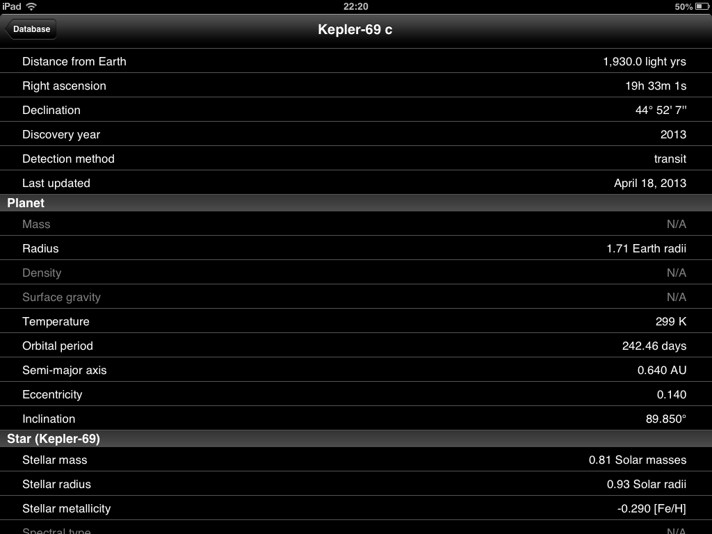 Using my Exoplanet app for the iPad, here is the pertinent information about this planet that is 1,930 light years from Earth.