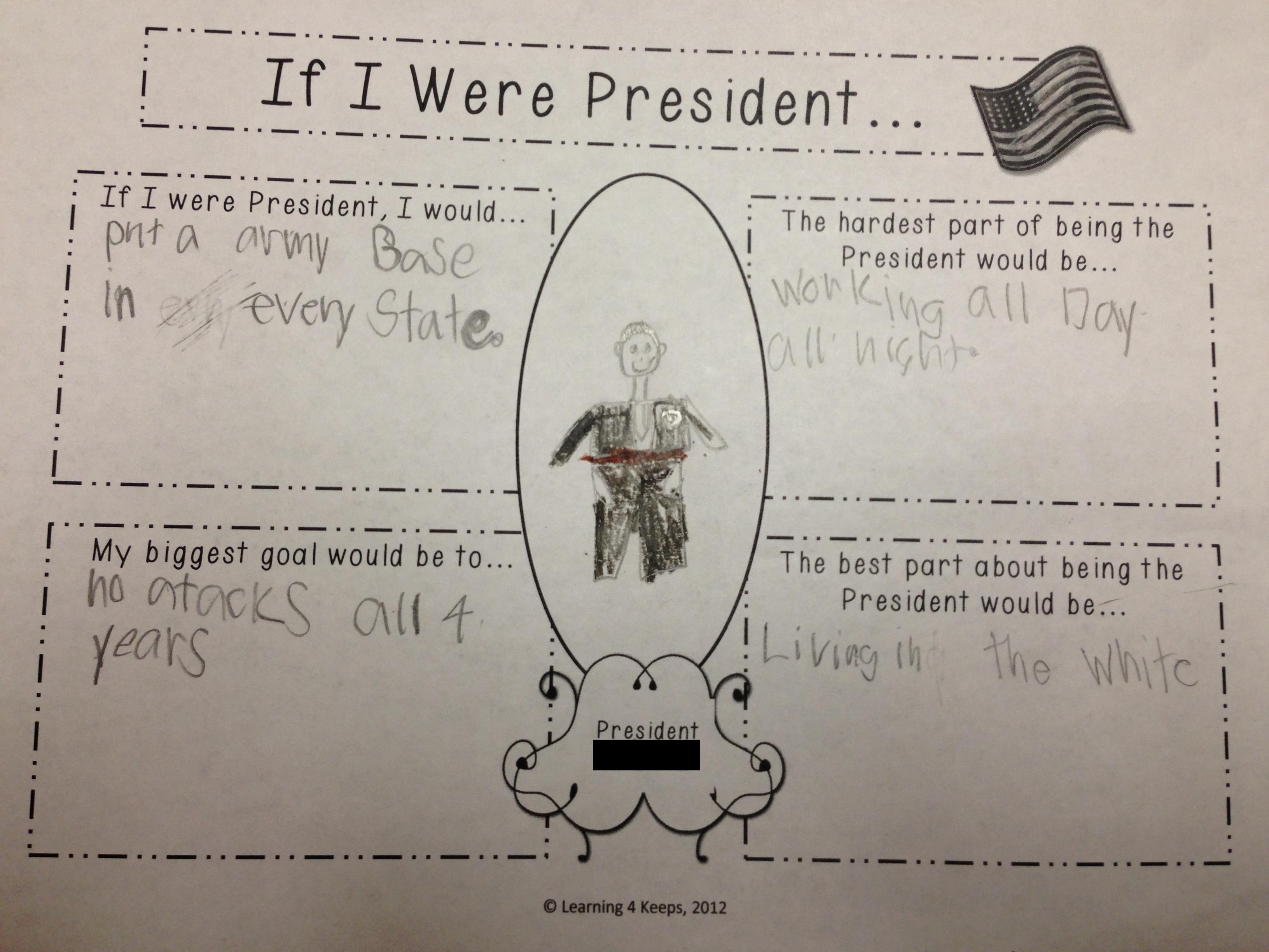My 8 year old son had an assignment today to imagine he were the President of the United States. It was a great assignment and he brought that work home for us to review and his writing made me realize that this little guy understands more about the world than I give him credit.