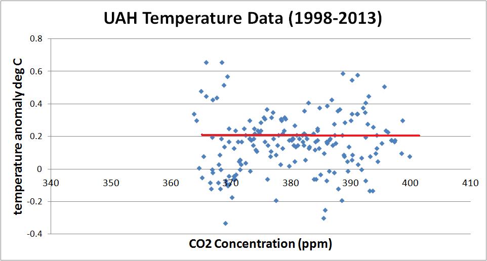 See that flat line? That means as atmospheric CO2 concentrations have increased the global temperatures have been flat. For 15+ years.