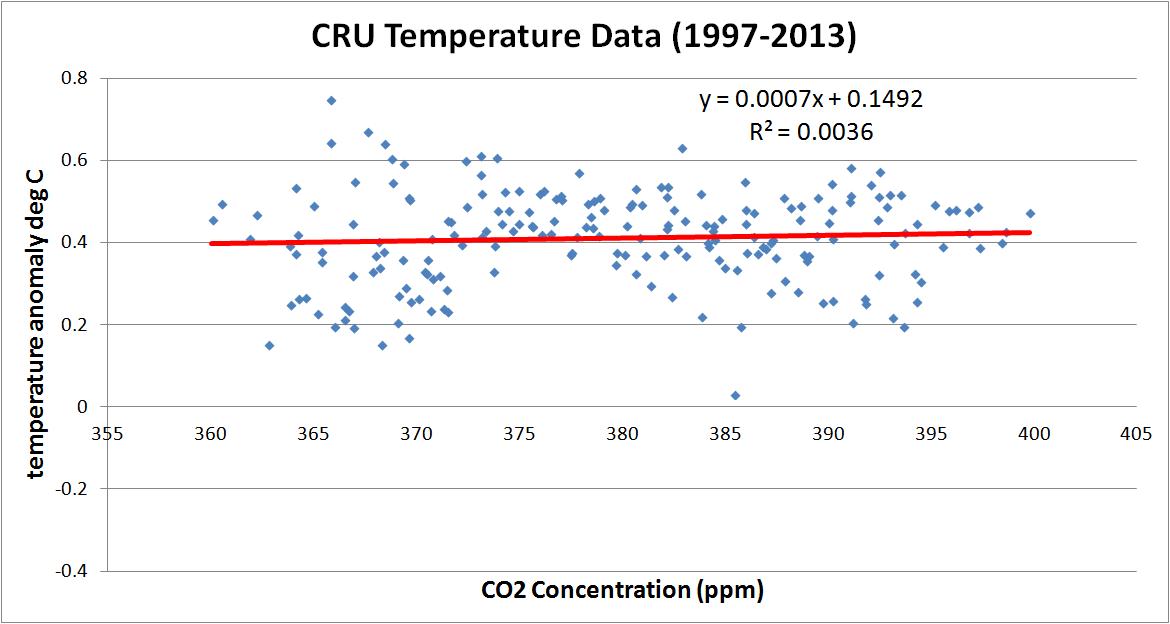 Global temperature anomalies have been flat for the past 17 years while atmospheric CO2 continues its steady increase and this is shown by the lack of correlation in the following graph.