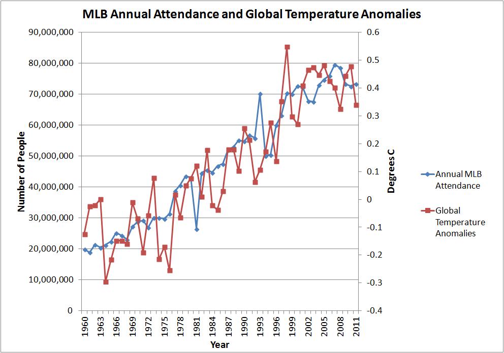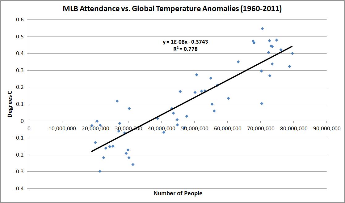 Believe it or not, the annual attendance totals for all Major League Baseball (MLB) parks has a very strong correlation with the global temperature anomalies as measured by the Climate Research Unit (CRU).