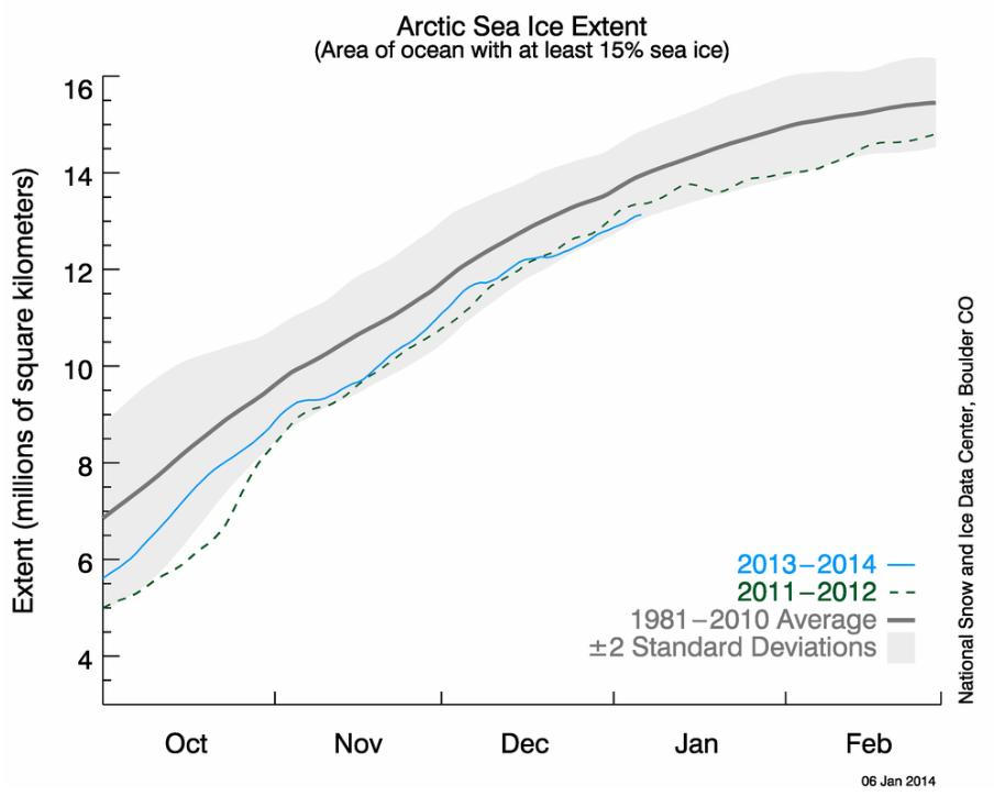arctic iceThe AGW cult claims that we had an unusual melting of Arctic sea ice during the summer of 2013 and this caused this disruption in the polar vortex this winter.  But from this link, we see again that the 2013 Arctic sea ice extent (shown as the brown line) was very close to the 30 year average (shown as the black line).  Moreover, we see that there was much more melting of Arctic ice in the summer of 2012 (shown as the dashed line) but that didn’t cause the polar vortex to send the US into a deep freeze last winter.