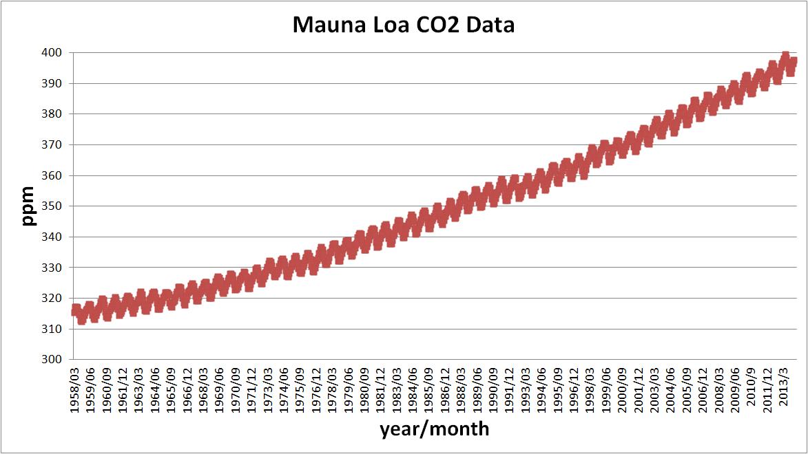 Here is the graph of atmospheric CO2 concentrations and sure enough, we are definitely pumping more CO2 up there and I’ll concede the AGW point that most of this increase is from humans.