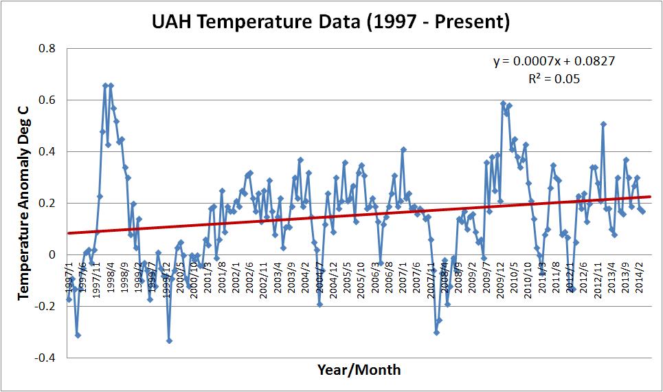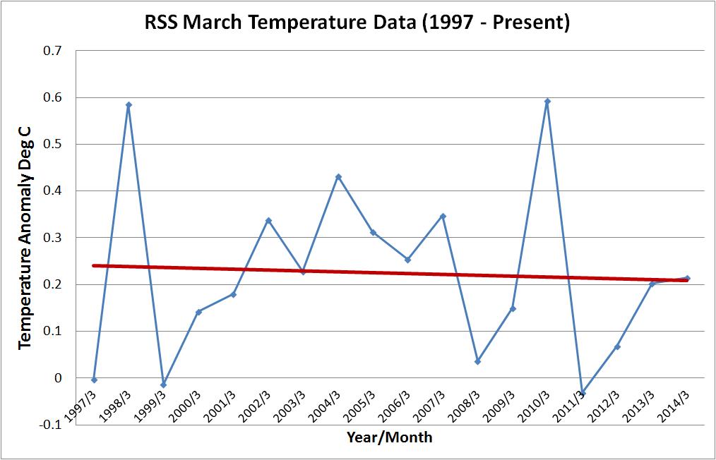 The following graphs show the March global temperature anomalies over the past 17 years for 2 well respected temperature data sets. (NOTE – I’d normally include a 3rd, the Hadley Climate Research Unit (HADCRUT3) data but as usual they are very late and March 2014 has not been updated on their website).