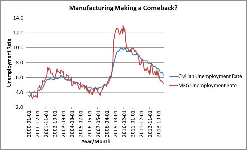 Here is a graph contrasting the civilian unemployment rate and the unemployment rate for the manufacturing industry that may show signs of a small resurgence of manufacturing in the US.