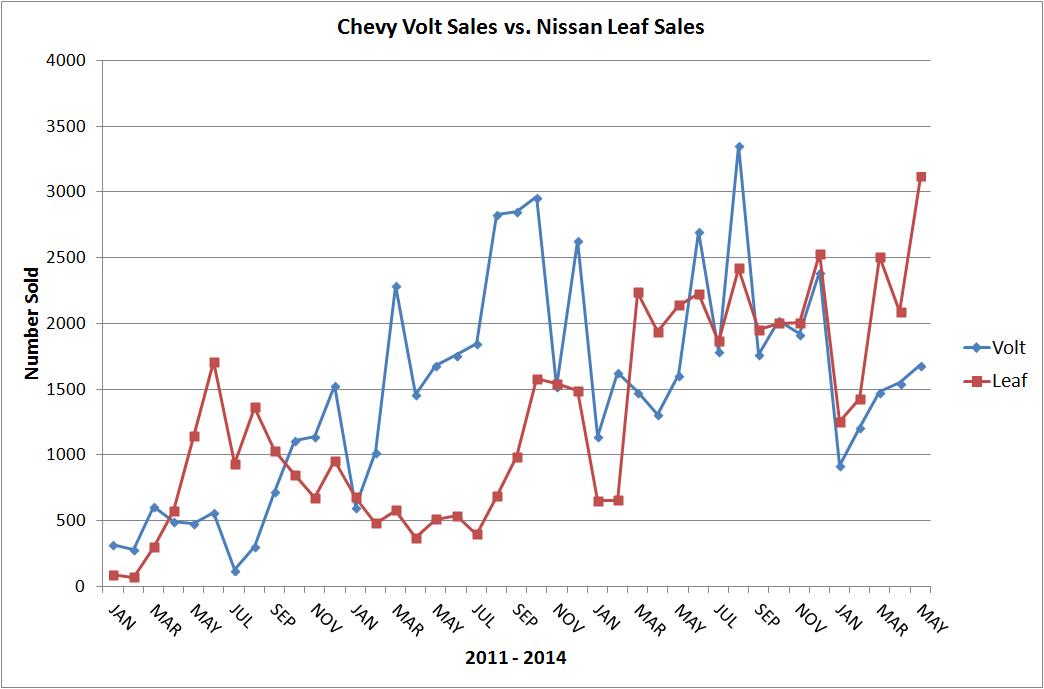 Thanks for posting the graph with the Volt sales numbers. Just eyeballing the graph, sales seem to amount to 1,500 per month, which is just 0.5% of total sales. Not much of a percentage, but we have to be aware that this is a niche car. Nobody will drive it in Alaska or in Florida, where excessive amounts of battery energy will have to go to heating or air conditioning. So yes, it’s a car for the moderate climates and will never be able to compete with a large SUV or pickup truck in terms of popularity. It would be interesting to see how many Corvettes were sold. Compared to the Nissan Leaf, the 1,500 per month look relatively good. I don’t have the raw data, but it looks like the Leaf sells somewhere between 1,500 and 2,000 a month. The trend is peaking sharper in April compared to the Volt’s, but in terms of numbers both cars are in the same ball park. If the Volt’s 1,500 is a failure we should be fair and label both cars failures. So, go ahead and slam Nissan, too.
